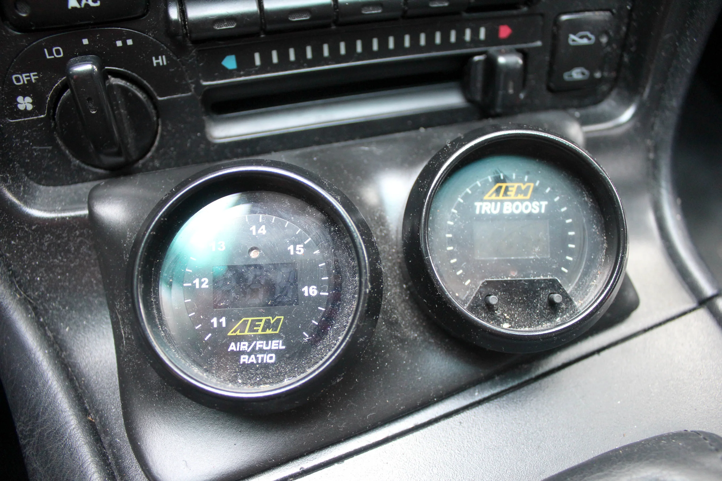 In the center console, the previous owner added some legitimate metering. AEM TruBoost and AEM UEGO wideband are great choices, as I had them in my old MR2 and they worked fantastically. Previous owner, let's just call him Tom (cuz that's really his name) also mounted them in the handy/fancy ashtray pod. I had my old gauges in the A pillar trim, and as much as I loved the F&F JaRule street cred it gave me, I really didn't like the vision it blocked on left hand turns. Tom also threw in the OEM ashtray in case I changed my mind.