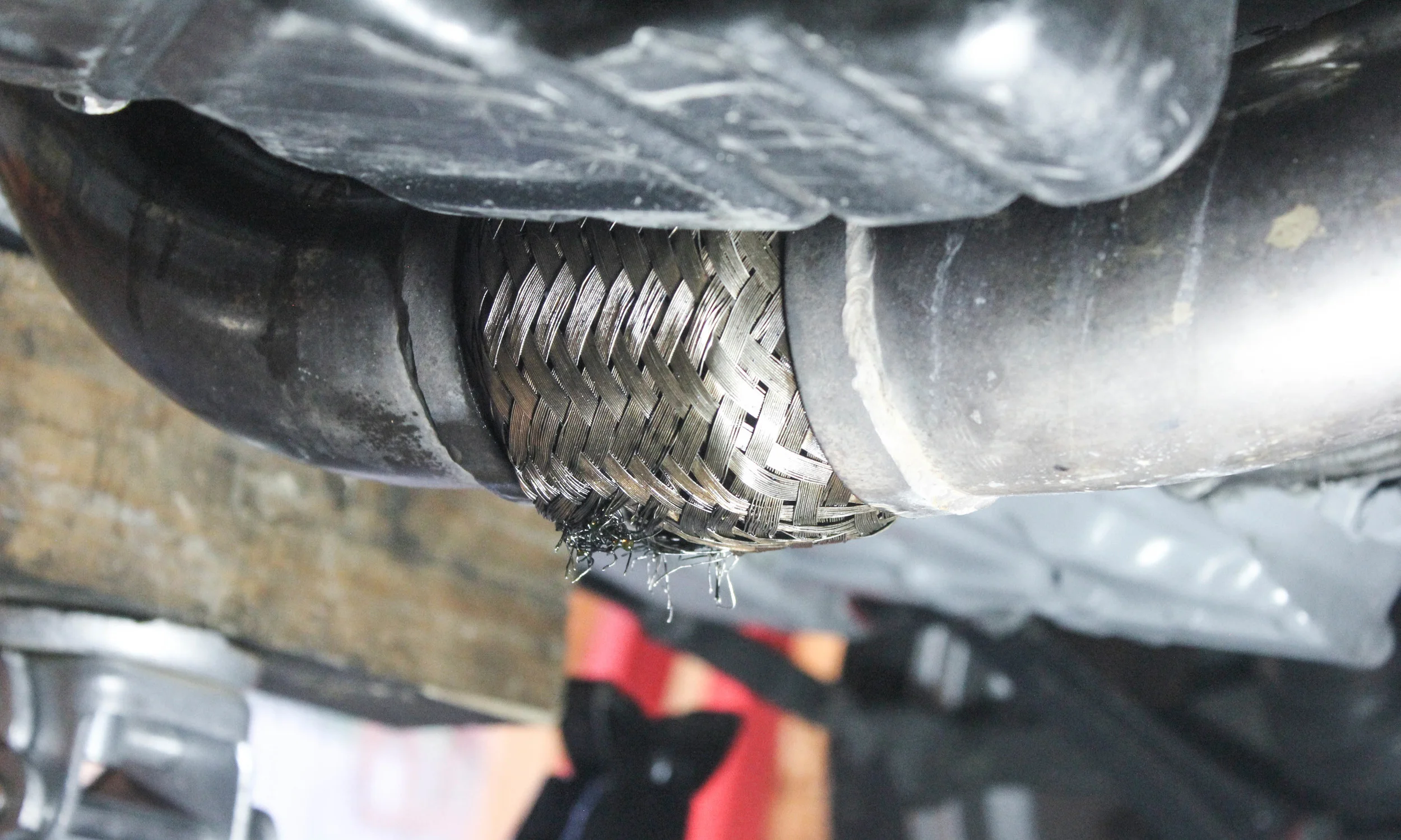 Luckily I had another crappy eBay-style replacement on hand. Paper gaskets for the... win? Put it all back together (that bottom nut... the worst) and filled with coolant, we were back in boost business. I enjoyed the car for about a week, back and forth to work a few times... but something didn't sound right. It was getting worse as I drove it more too. I had a dreaded exhaust leak. When I finally had some time after work I discovered it was my B-pipe flex section. I knew it was on it's last legs of life, but the few runs without the mount must have laid the final blow.