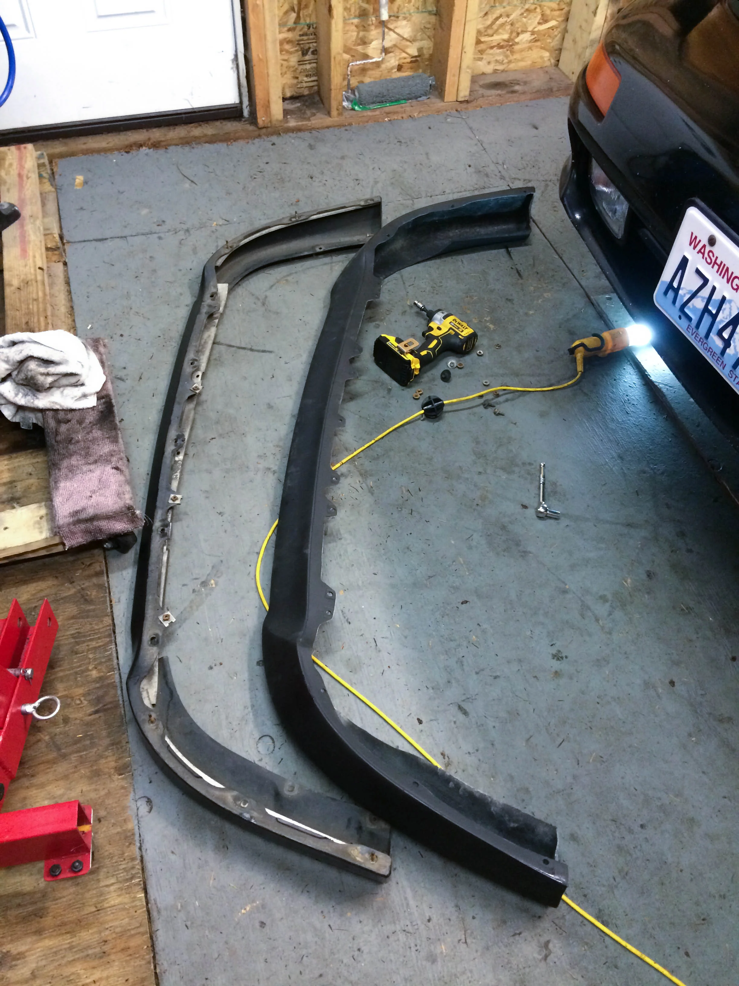 I got excited when his first package arrived and decided my 93 lip needed to be tossed immediately. It was cracked in many spots, and even chunks missing out of it. First remove the old lip, jack the front end up and take off about 15 10mm nuts and bolts. Basically I would rather be that guy rocking a primered lip over OEM poly one (they weren't painted either).